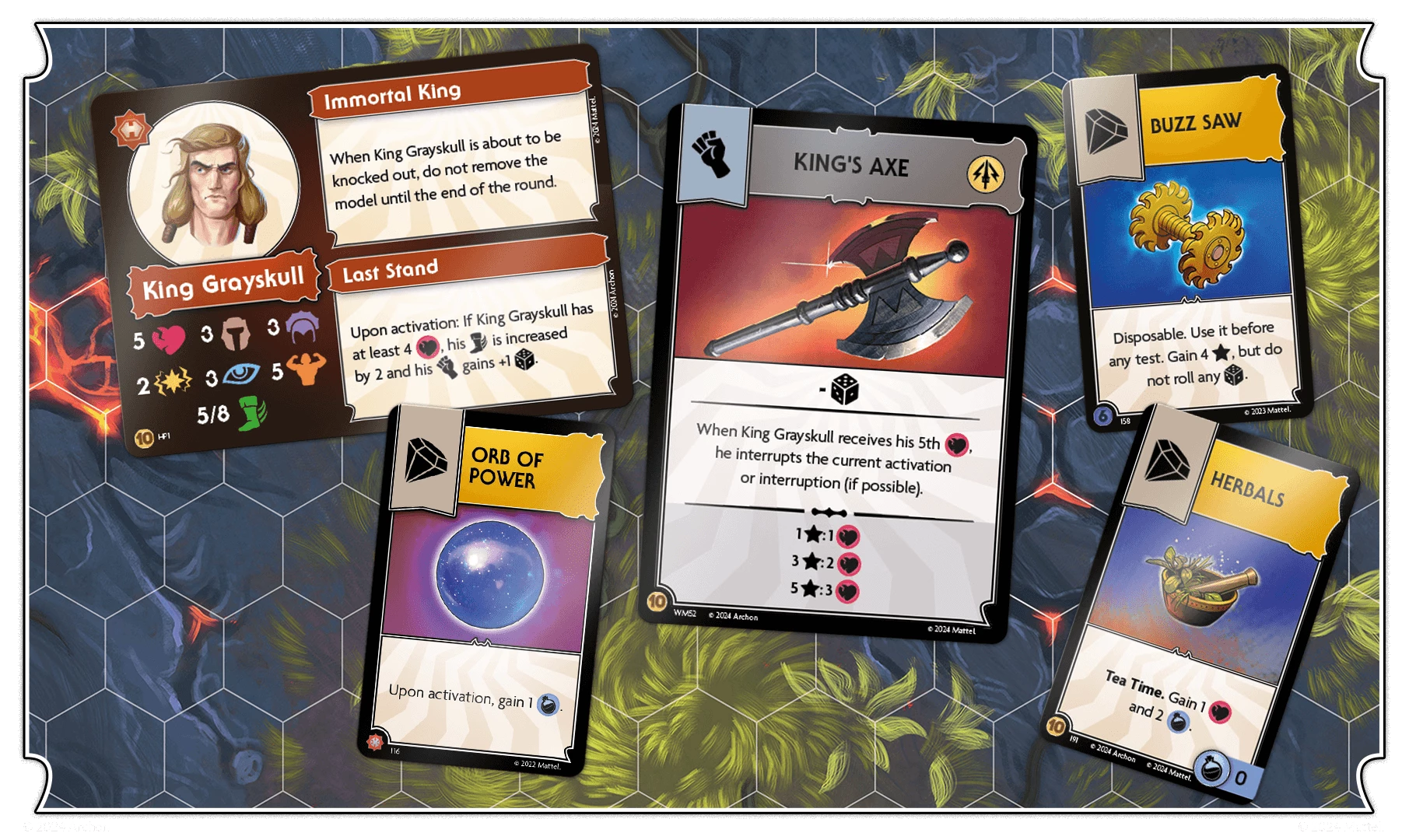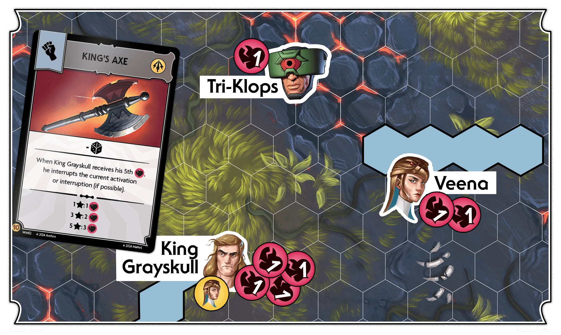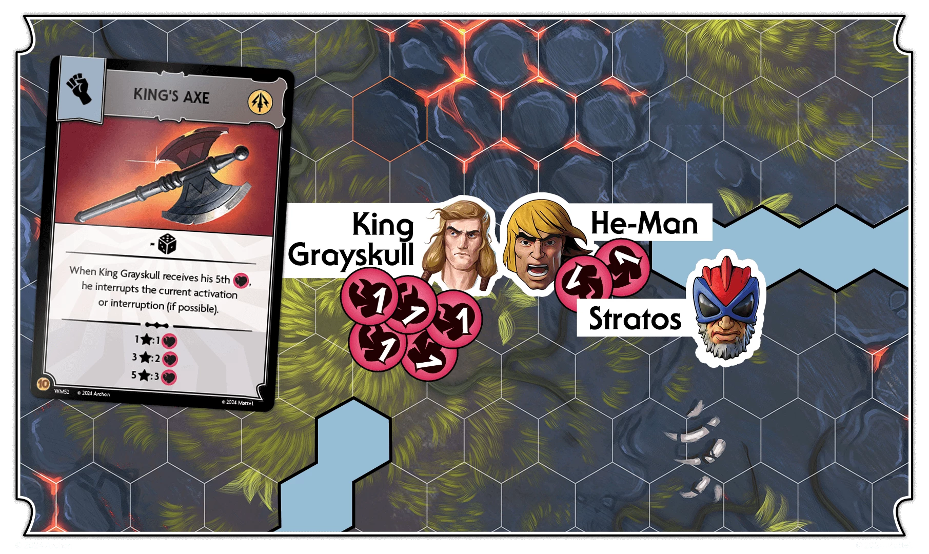 King Grayskull wields his iconic King Axe. When he receives his fifth wound, he interrupts and performs an attack against He-Man, leaving him with 2 wounds.