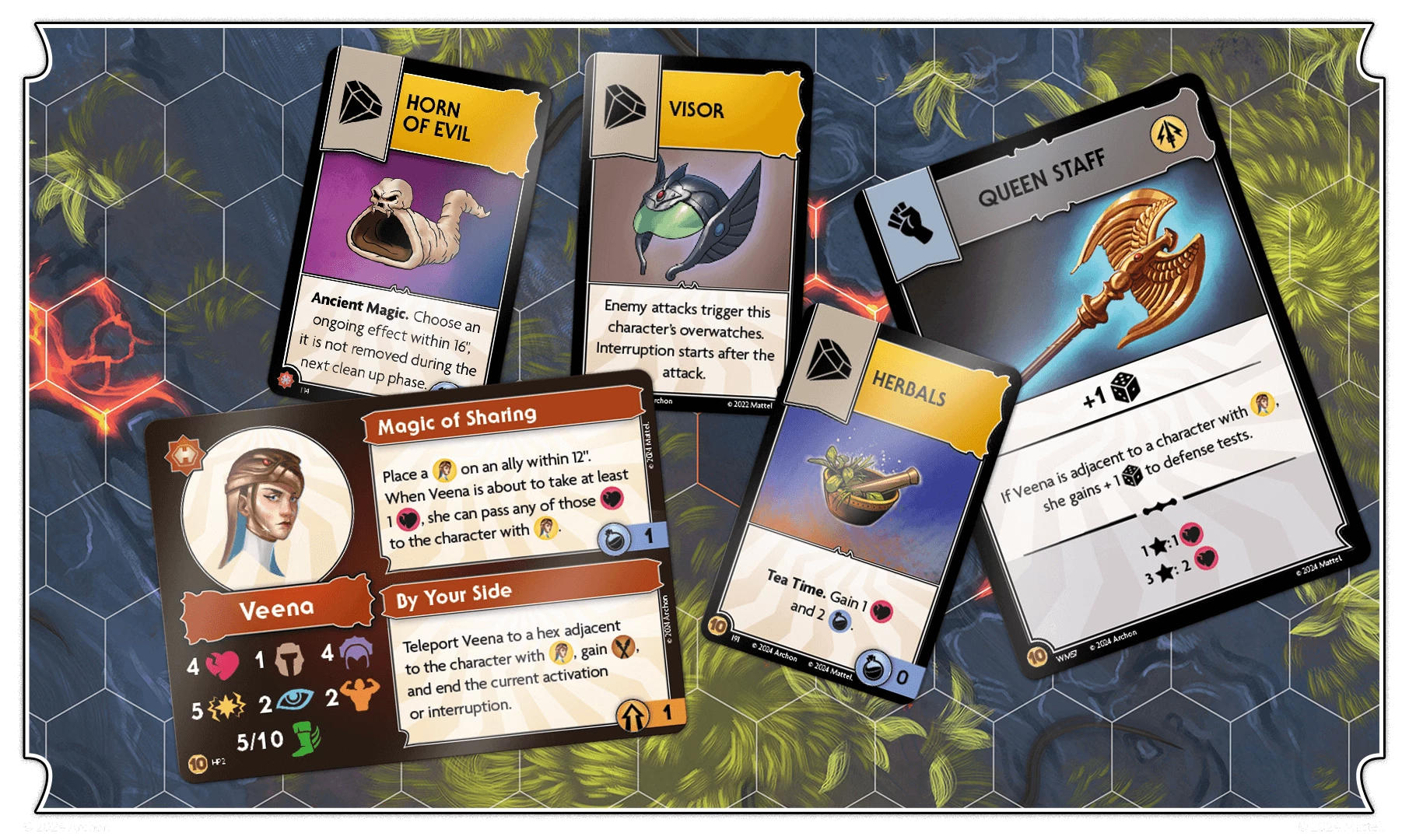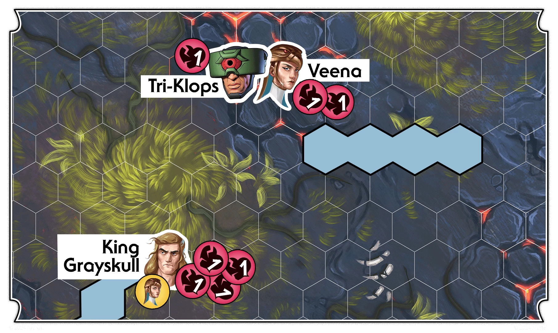 Veena goes first and is adjacent to Tri-Klops. She uses her Magic Sharing skill on King Grayskull, meaning any wounds taken by Veena can now be passed to King Grayskull.