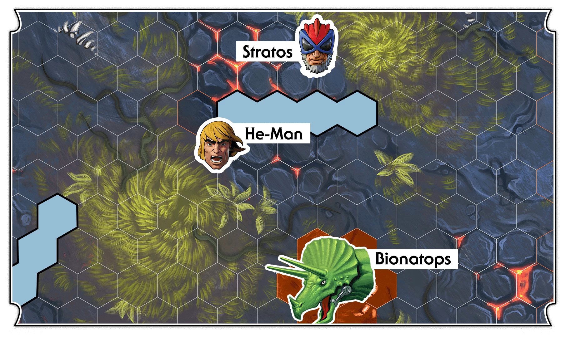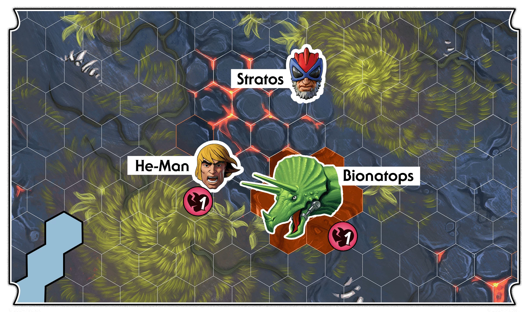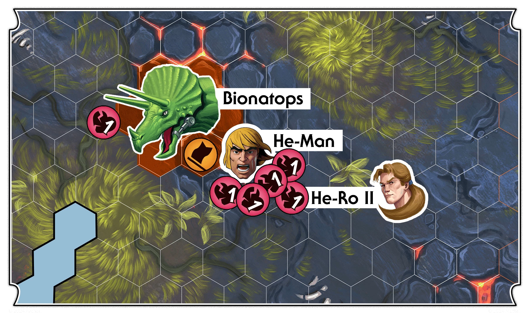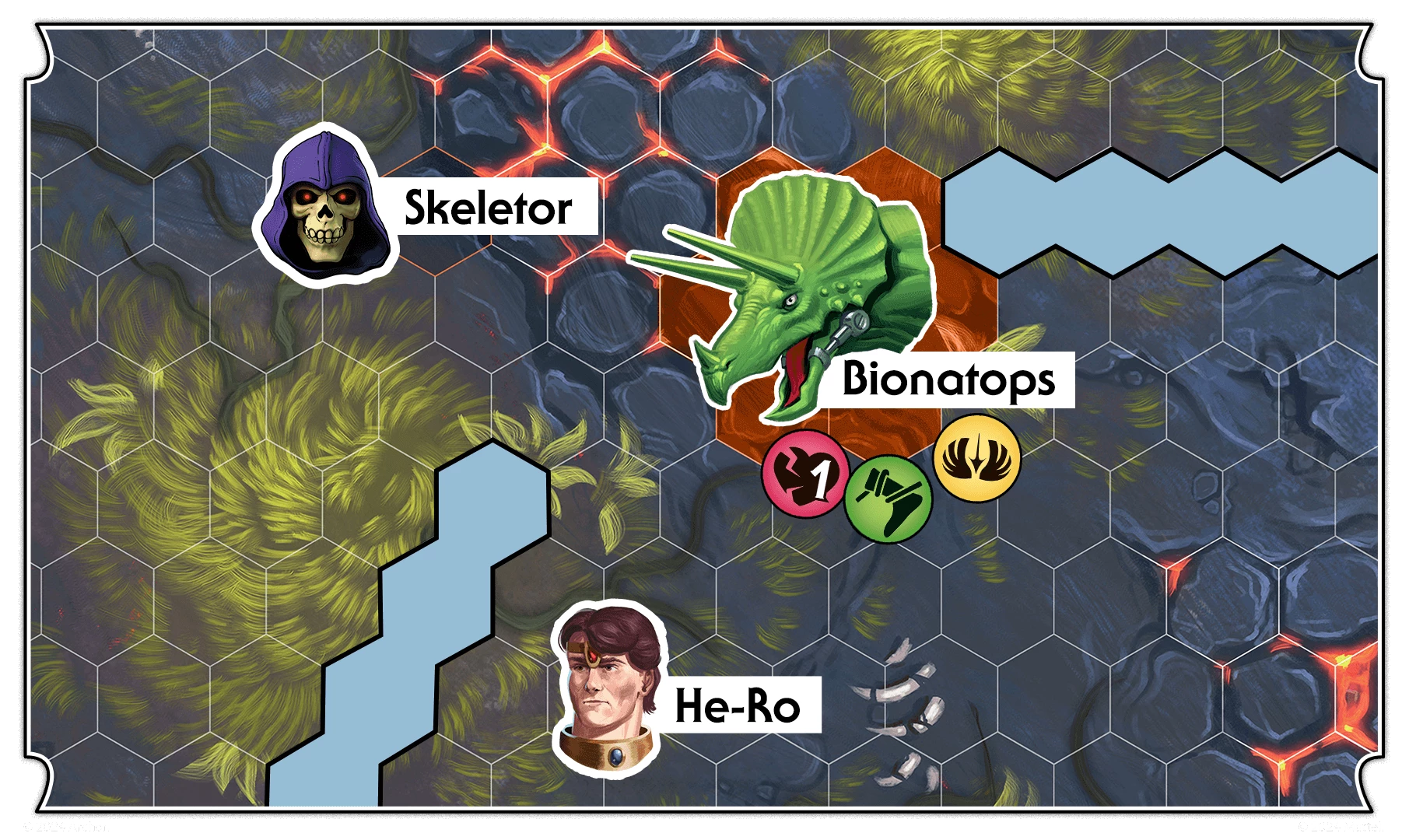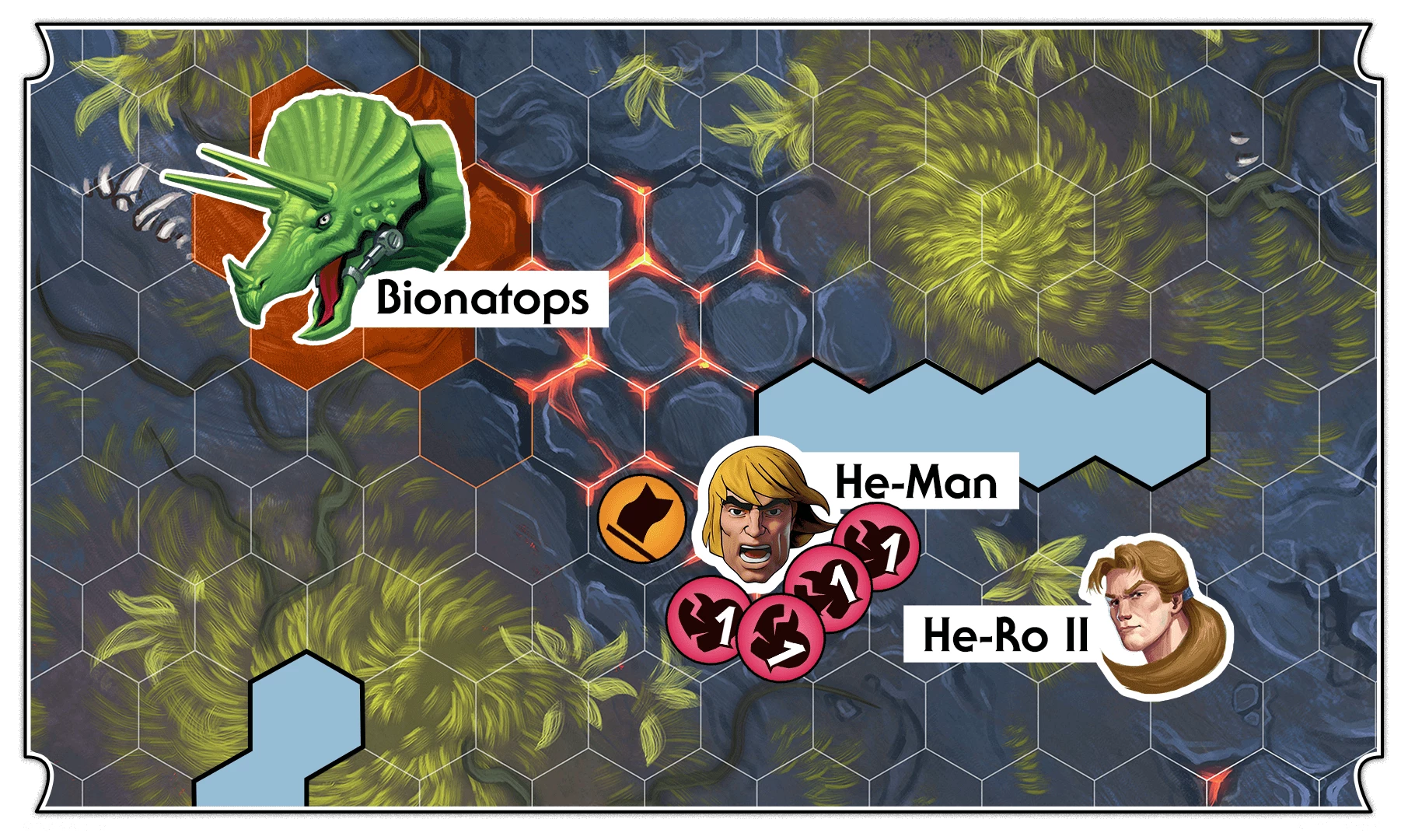 With one action remaining, He-Ro II utilizes the Tamer skill, selecting Bionatops as his ally. Bionatops advances towards He-Ro II and stops adjacent to He-Man and the obstacle. Using his Dinosaur Ram skill, Bionatops shatters nearby obstacles, resulting in himself and He-Man sustaining 1 wound each. He-Man is incapacitated, while Bionatops successfully seizes control of the objective.