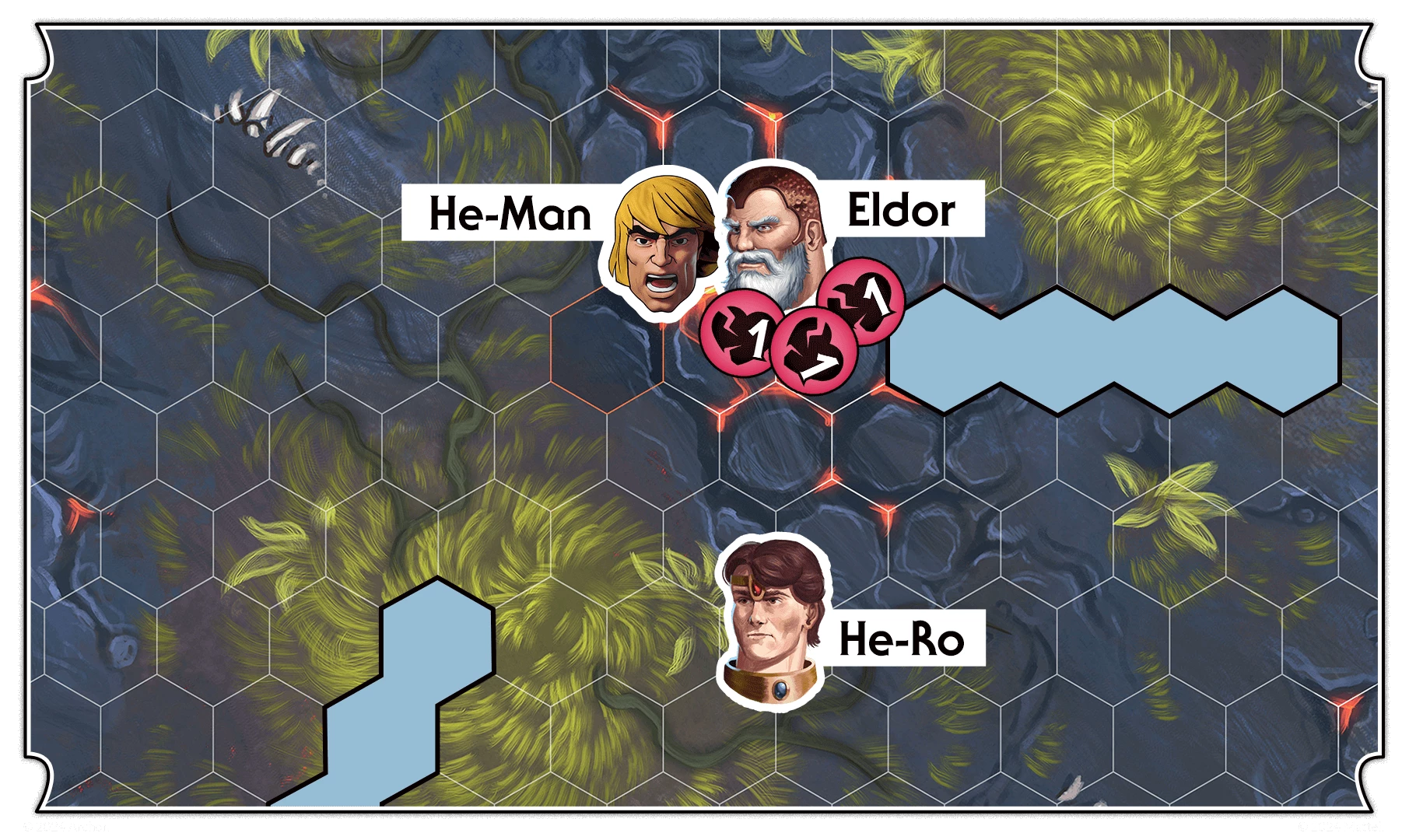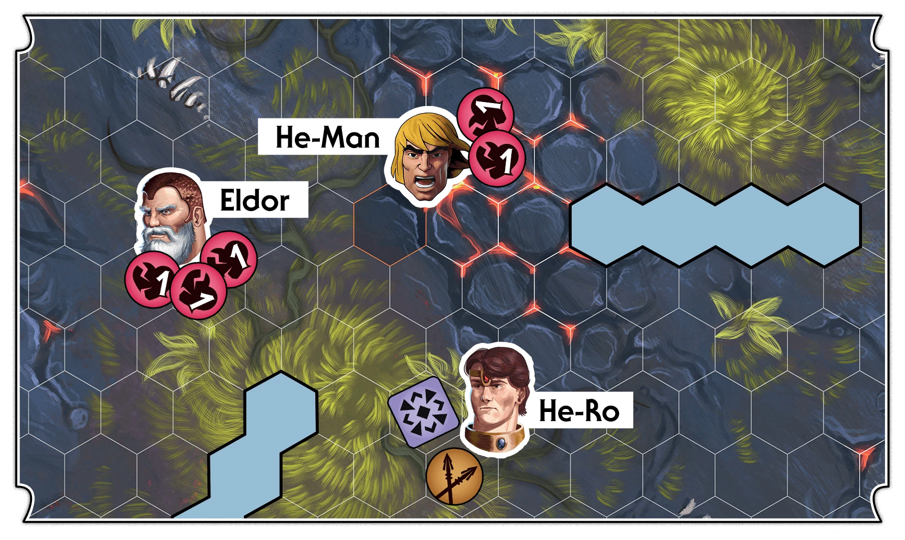 With the number of wounds in play now at 5, Eldor unleashes his Eldritch Spell skill, giving He-Ro an overwatch and a focus. The trap is set, leaving He-Man cornered and vulnerable.