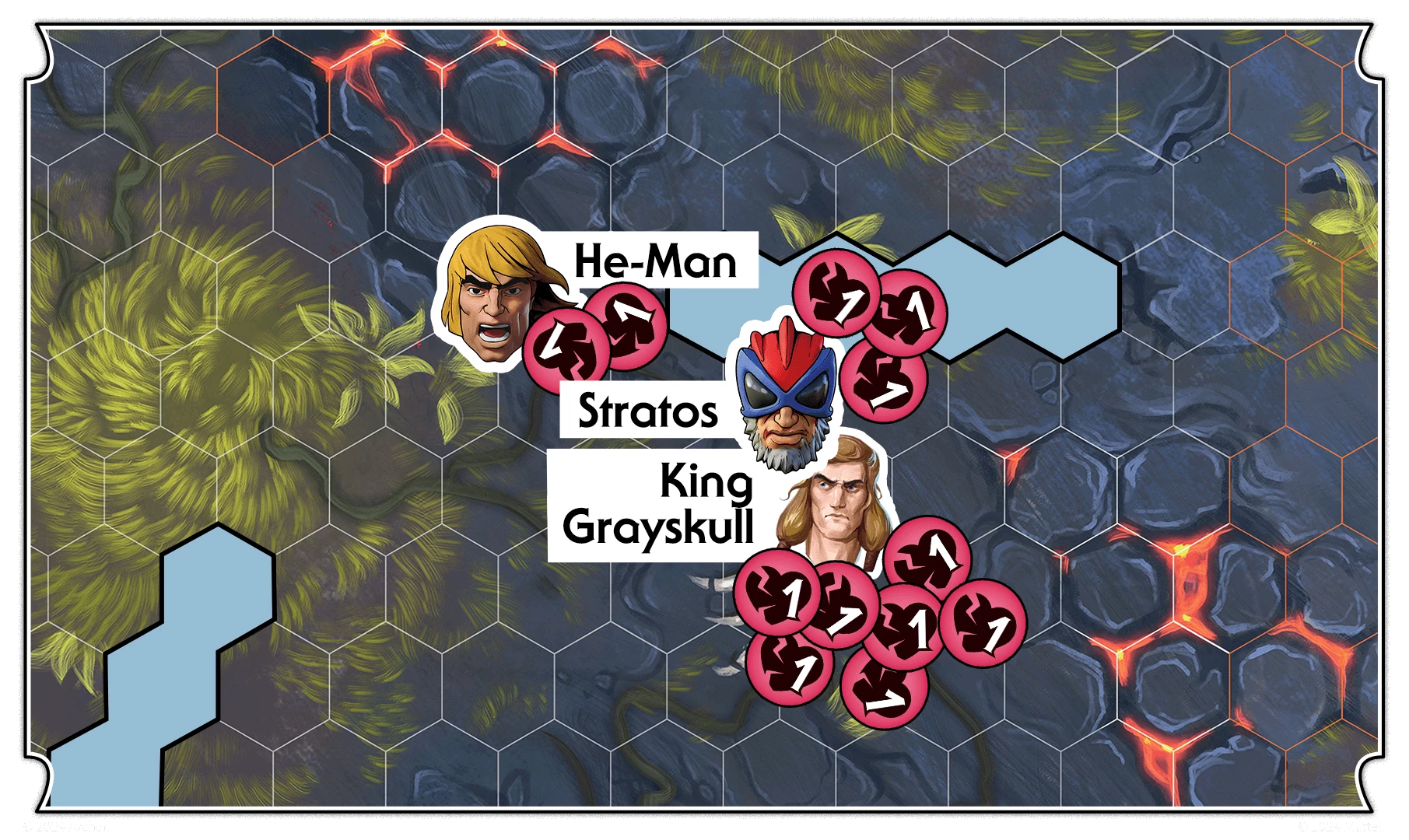 King Grayskull receives his fifth wound from the adjacent He-Man. Normally, he should be removed from the board because he reached his wound limit, but his ability allows him to stay on the board until the end of the round.