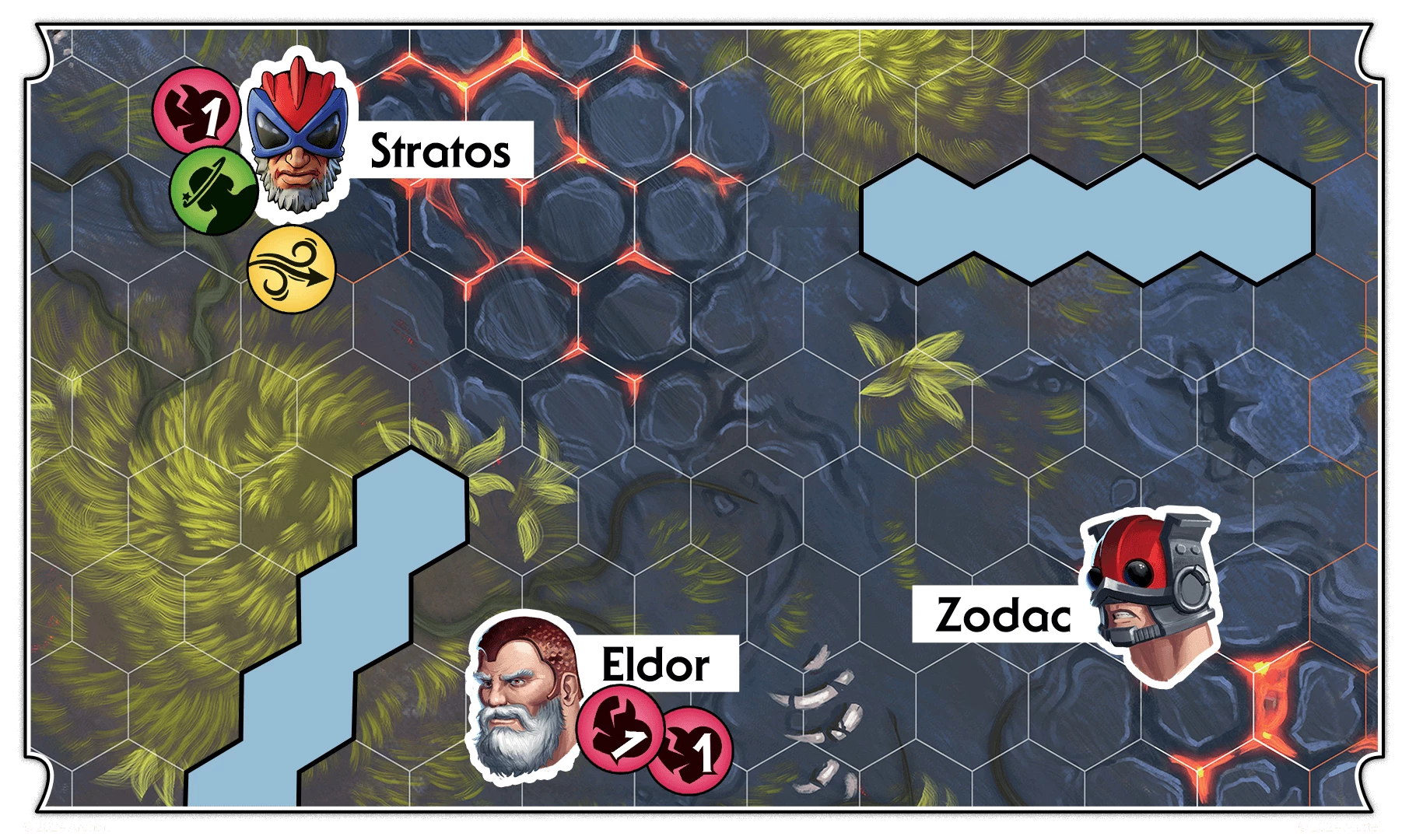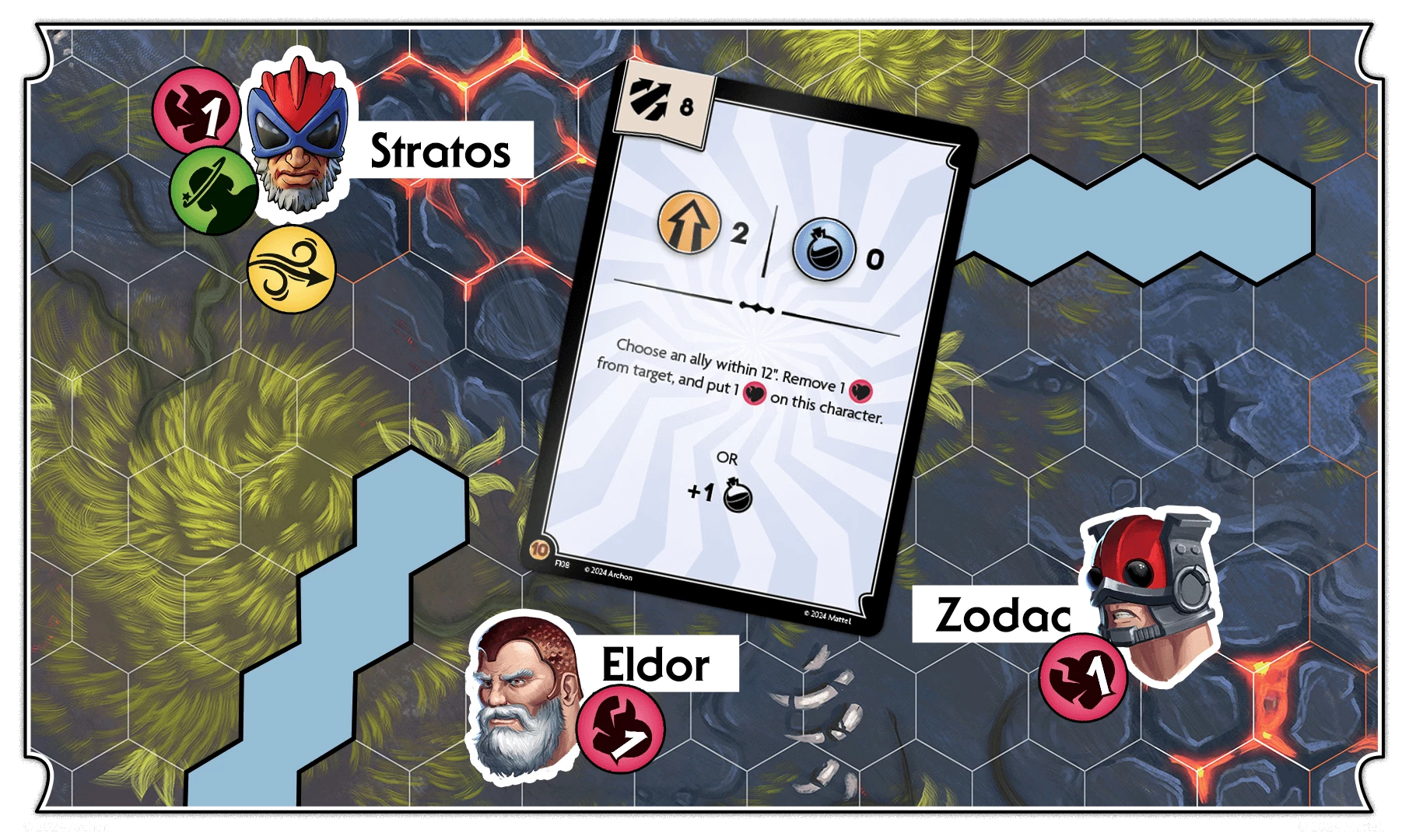Stratos was positioned safely 9 inches away from Zodac, aware of Zodac's ranged weapon with a range of 8 inches. Now, Zodac applies a knockdown debuff and a swiftness buff to him using his skill.