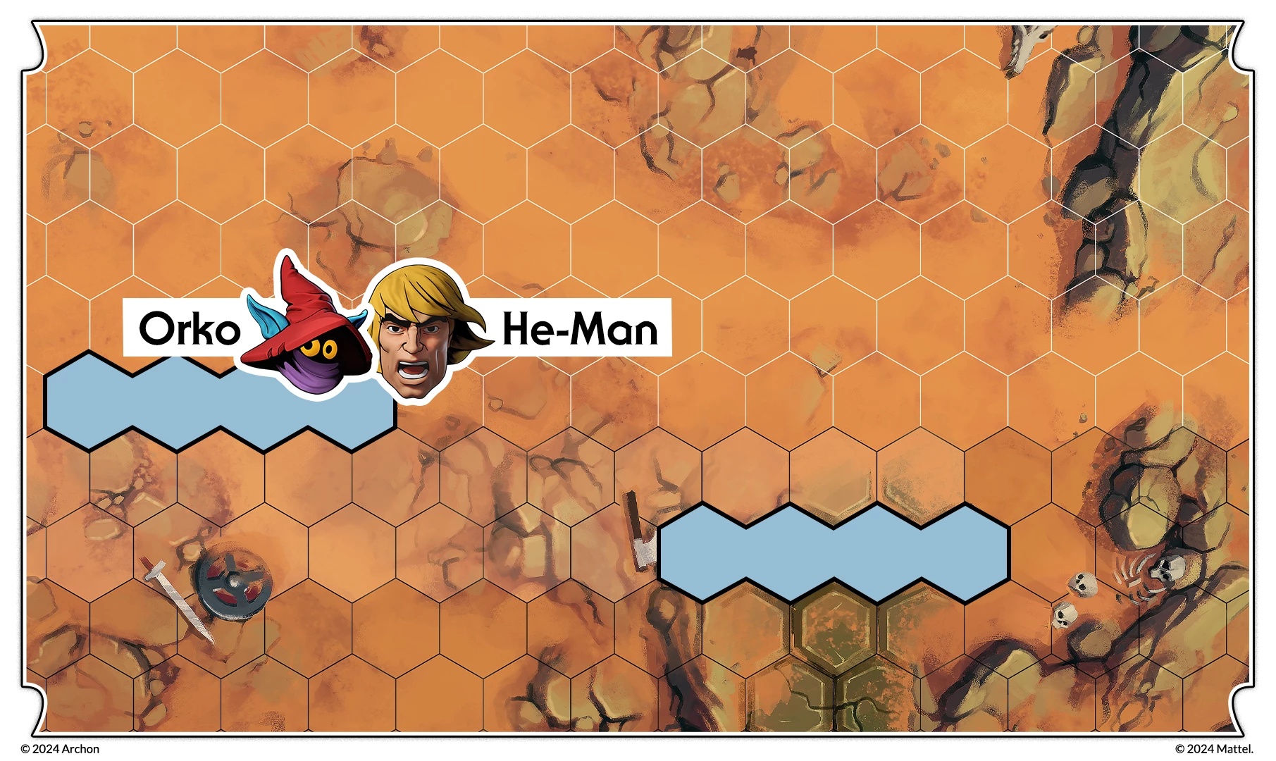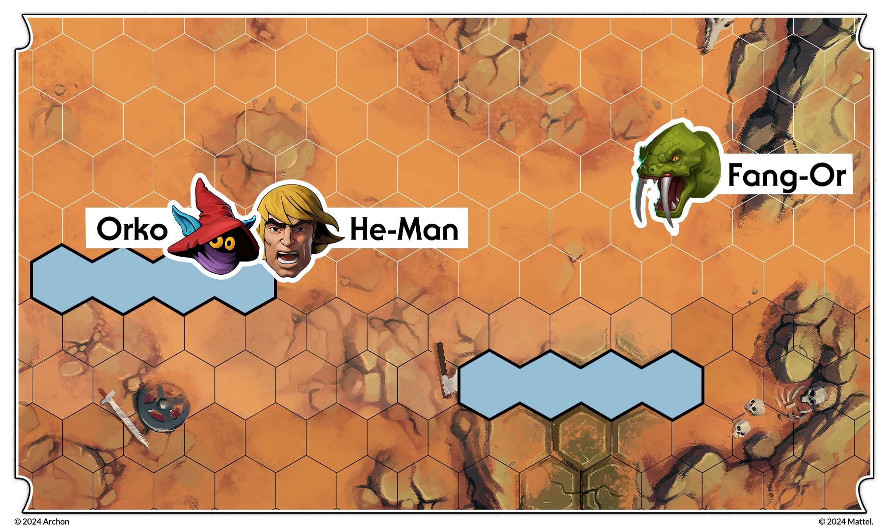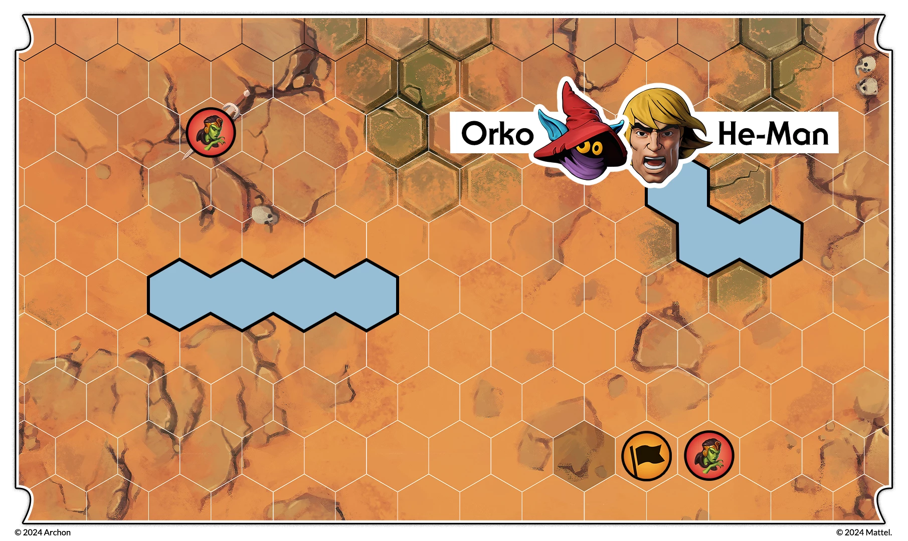 The opponent anticipates Lady Slither next to the objective token and positions He-Man to intercept her. However, they made a mistake. As the round drew close, Lady Slither materialized on the alternate mark, catching Orko off guard!