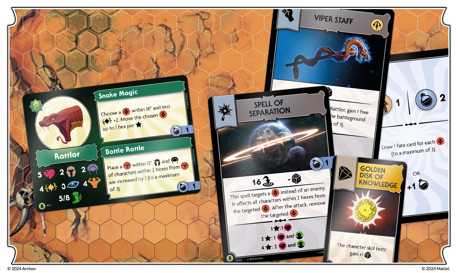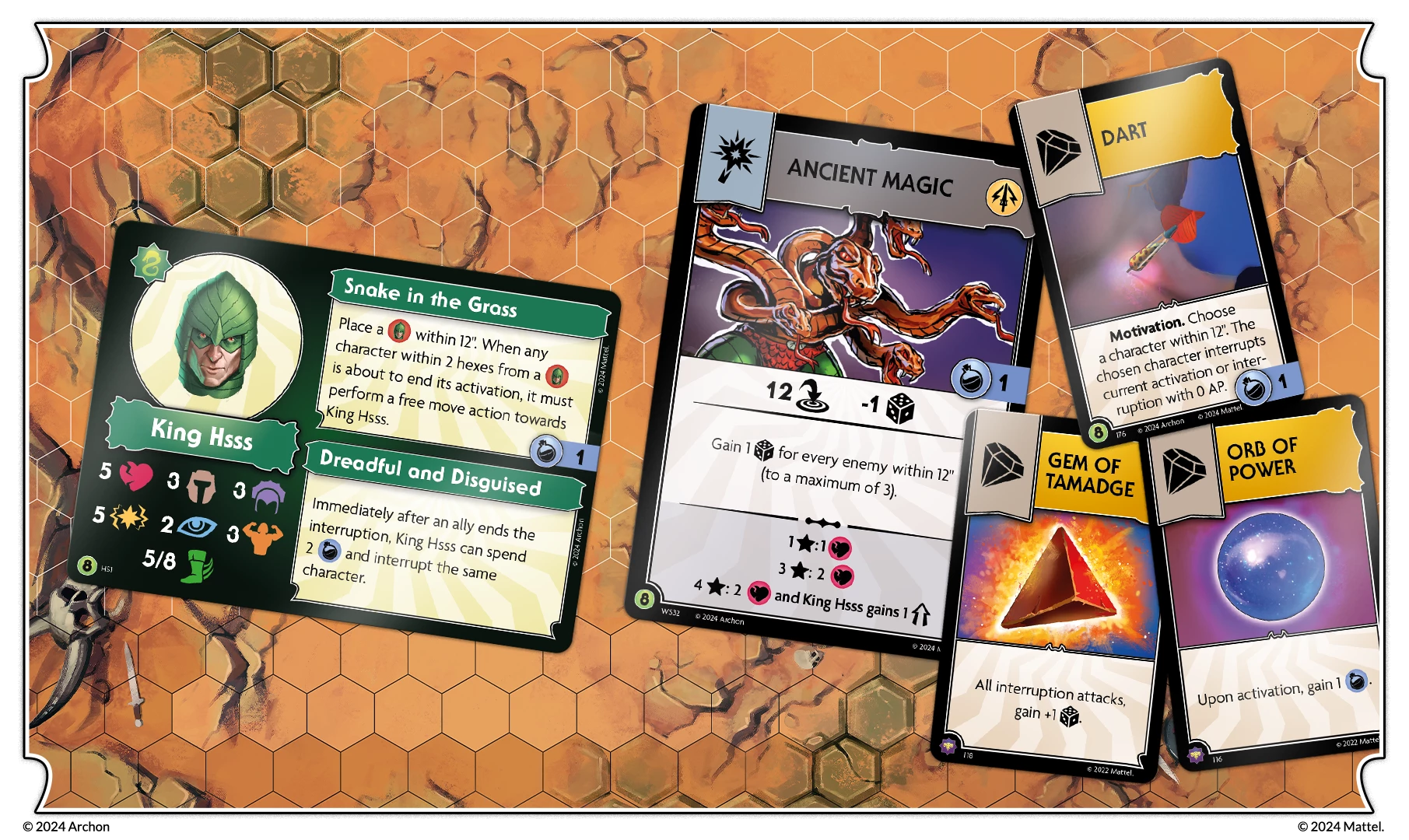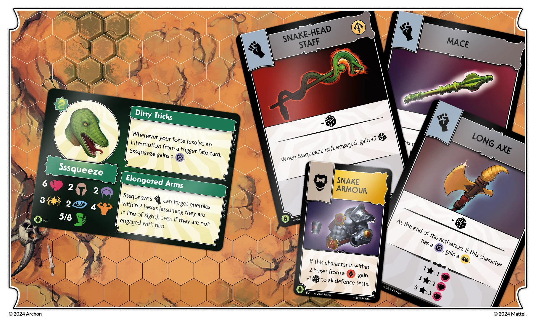 Snake Men, while lacking in resilience compared to other factions, find their saving grace in Sssqueeze. With his elongated arms, he can strike at foes from a distance of two hexes, granting him a significant edge over other fighters. Furthermore, Sssqueeze gains focus whenever a character in their force uses a trigger card, rendering him very challenging to eliminate, especially when he equips the appropriate gear.