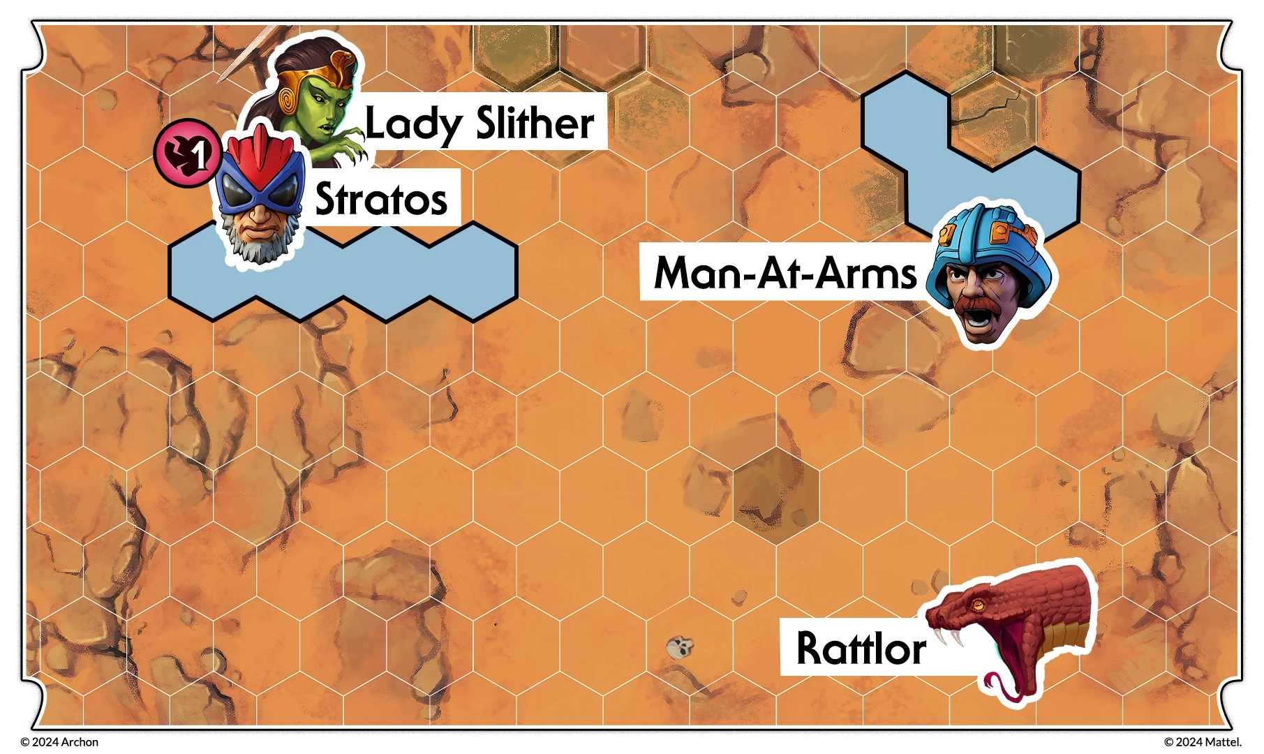 As foes wisely steer clear of Lady Slither's marks, Rattlor emerges to disrupt their cautious strategy.
