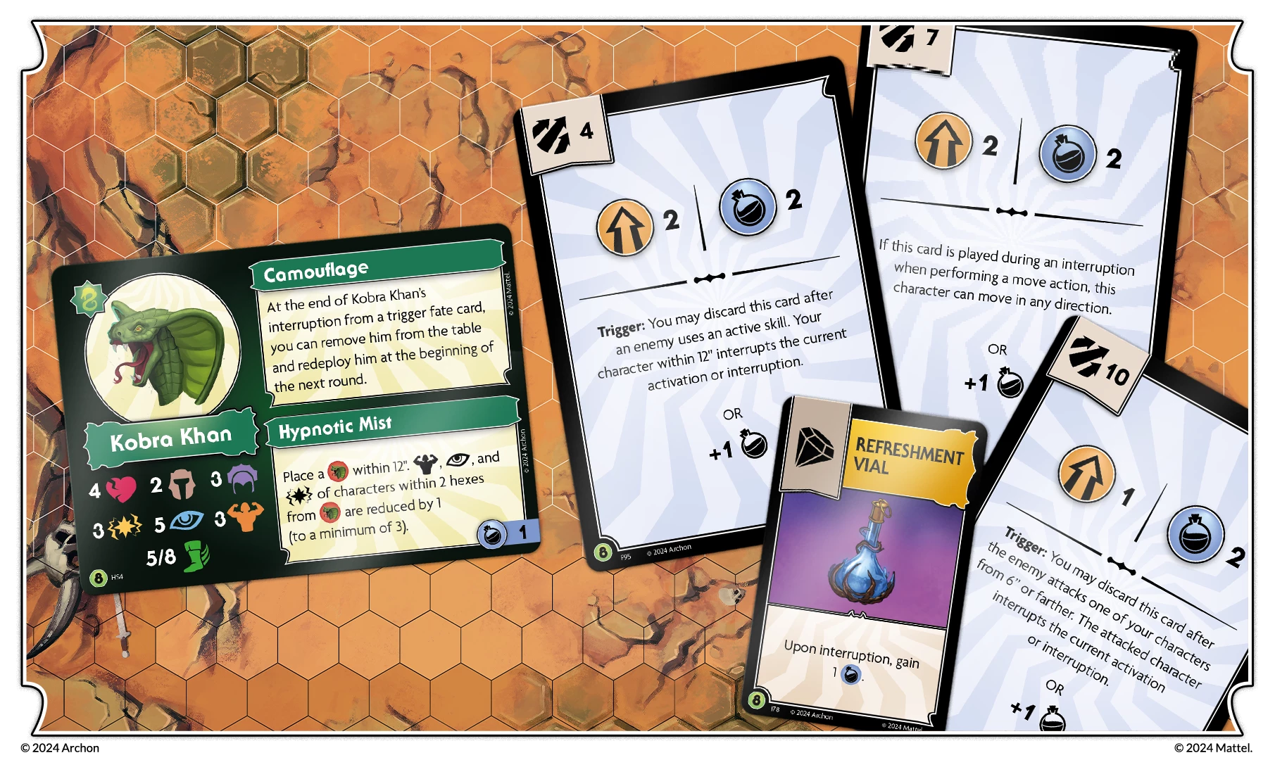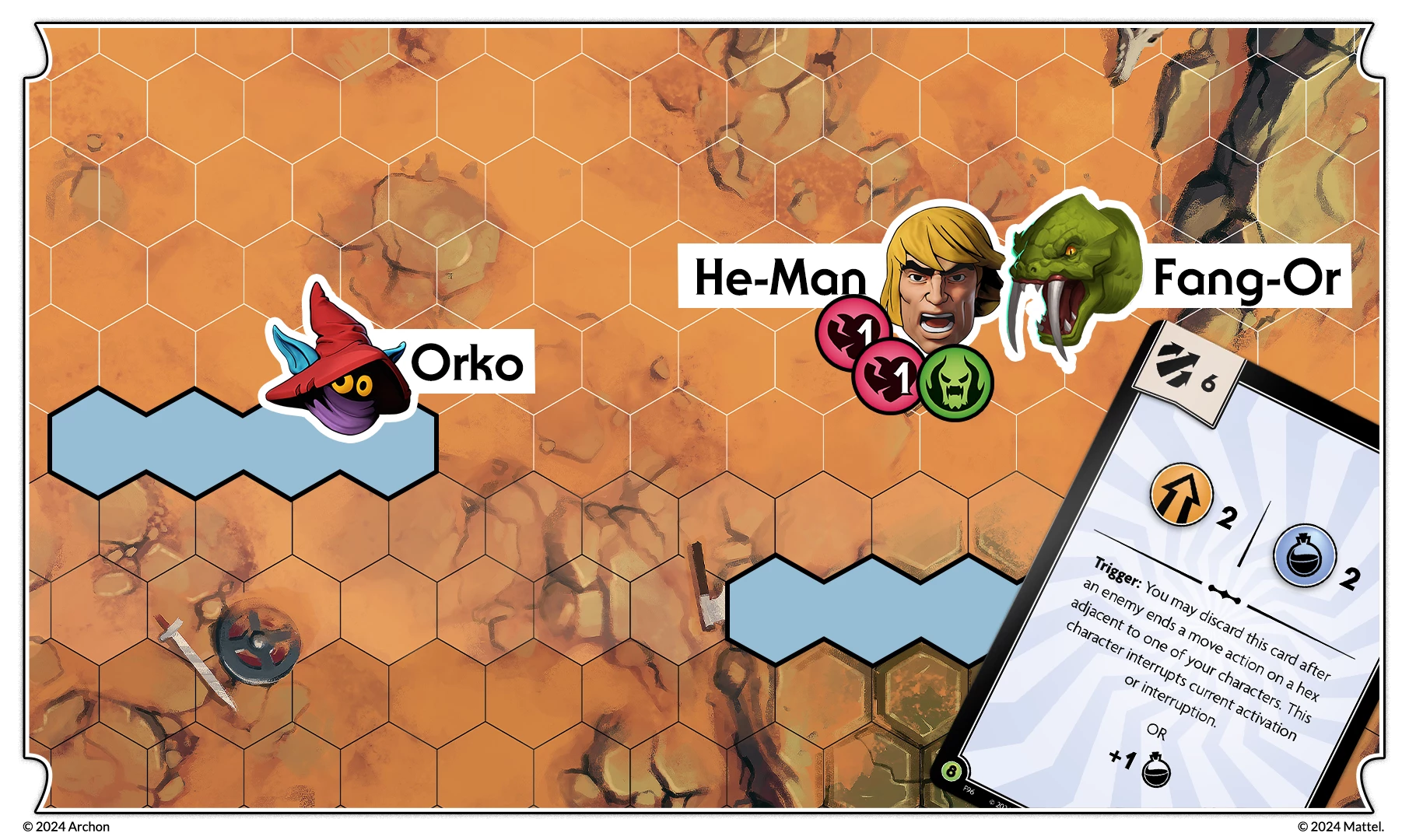 Fang-Or uses a trigger card to interrupt He-Man. First, he strikes with his enormous fangs, then follows up with a dagger thrust. Despite He-Man's retaliatory strike, the battle is far from over. Fang-Or will continue the onslaught during his activation! Should He-Man fall, Orko is next!