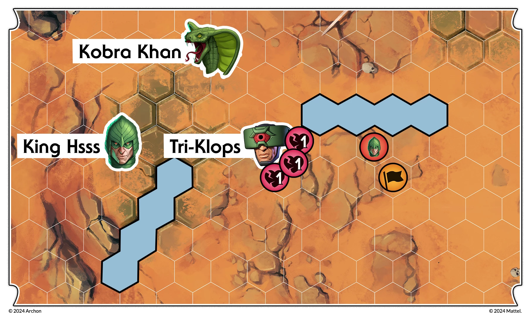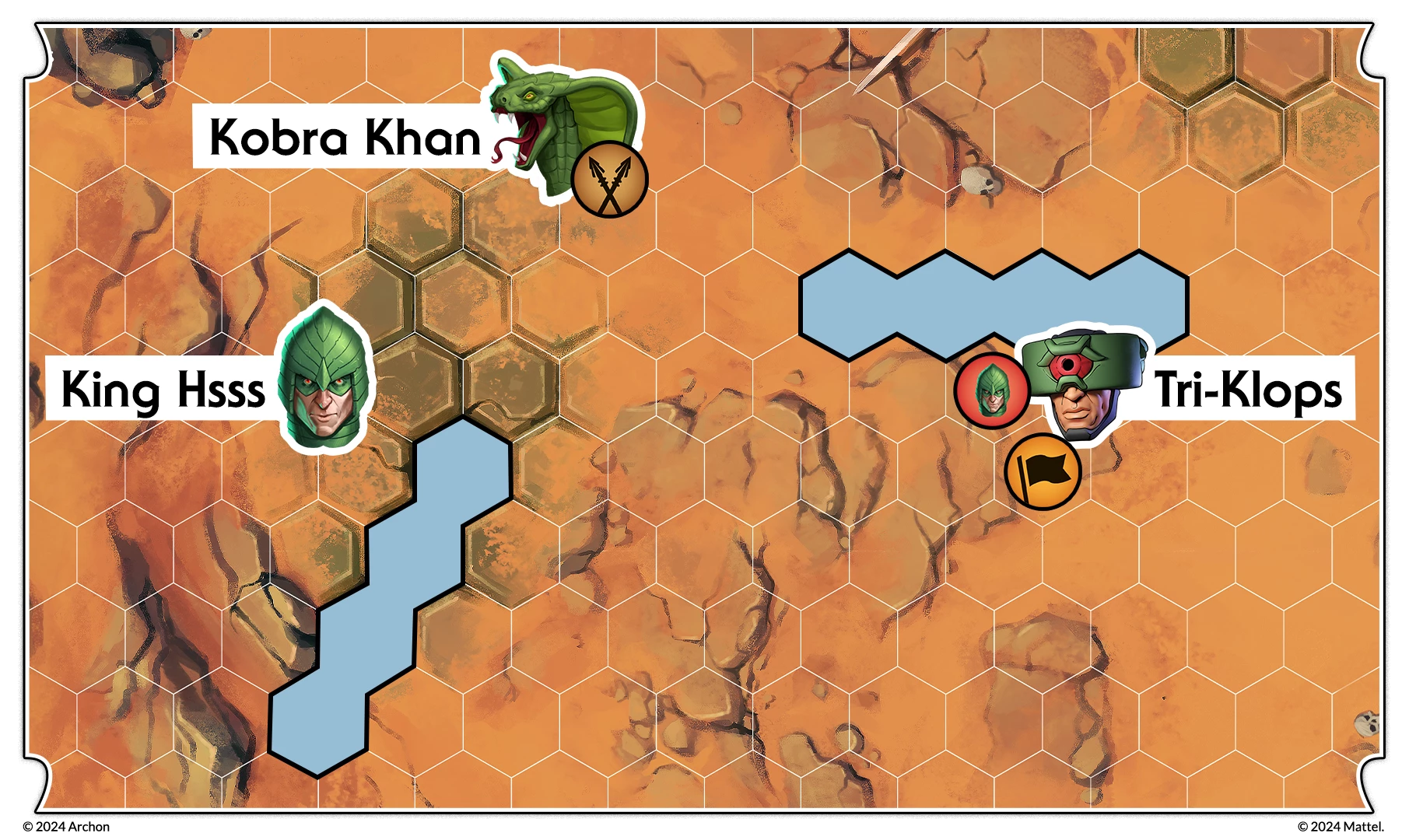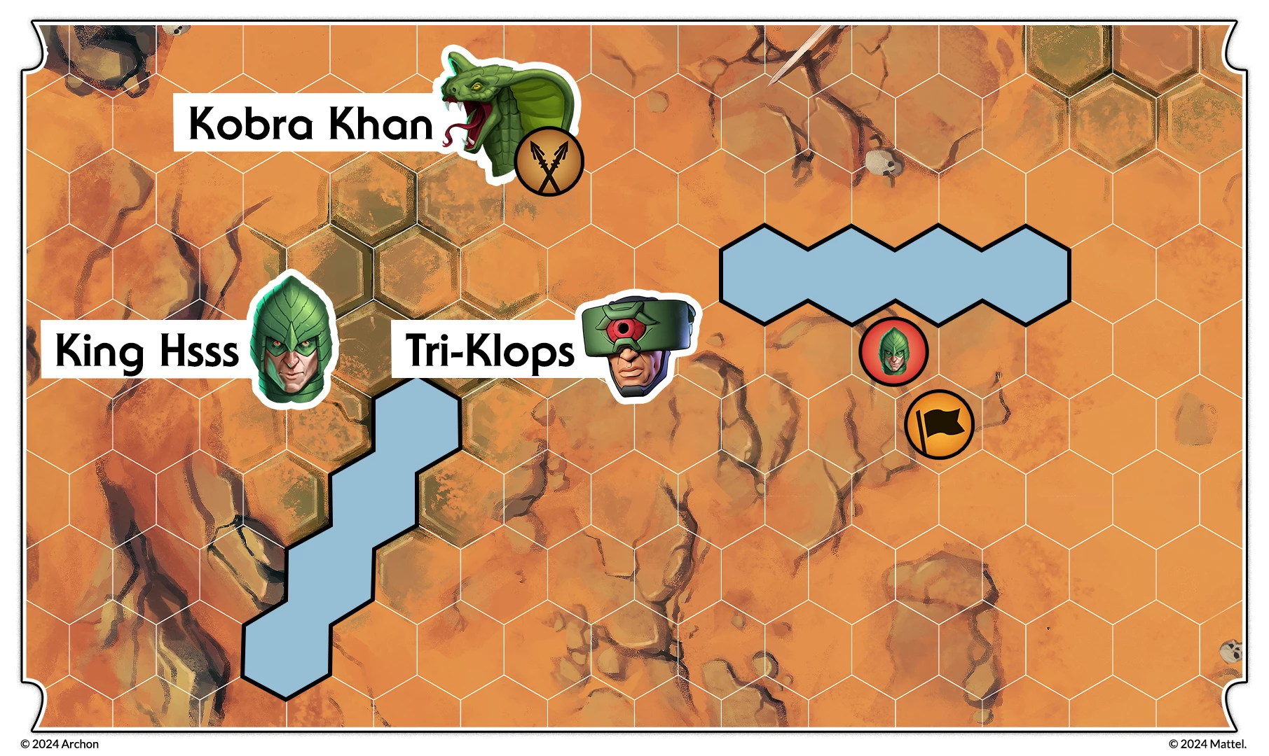 King Hsss places his mark adjacent to the objective token, preparing the ambush. Alongside Kobra Khan, the duo waits patiently for the prey. Their vigilance is rewarded as Tri-Klops ends his activation next to the mark, unwittingly falling into their trap.