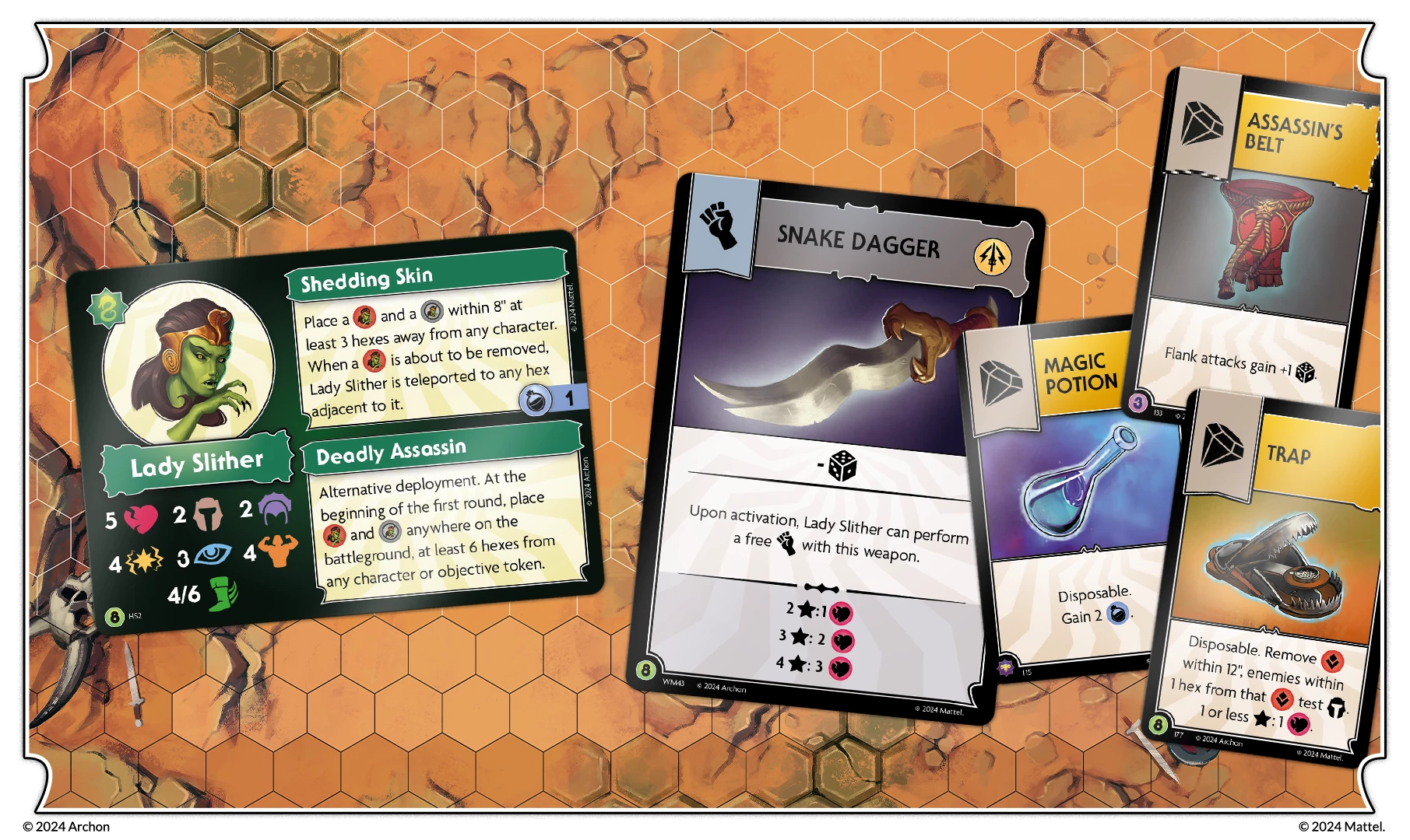 Lady Slither is a very interesting addition to the ranks of the Snake Men. The player deploys her by placing two markers on the battleground—one real and one fake. Upon the removal of the true token, Lady Slither materializes on the adjacent hex! Moreover, Lady Slither can employ this skill again, granting her unparalleled swiftness and agility across the battlefield. However, her strength lies not in direct confrontation but in exploiting vulnerabilities and targeting weaker adversaries. Thus, discretion and strategic maneuvering are paramount when unleashing Lady Slither's prowess.