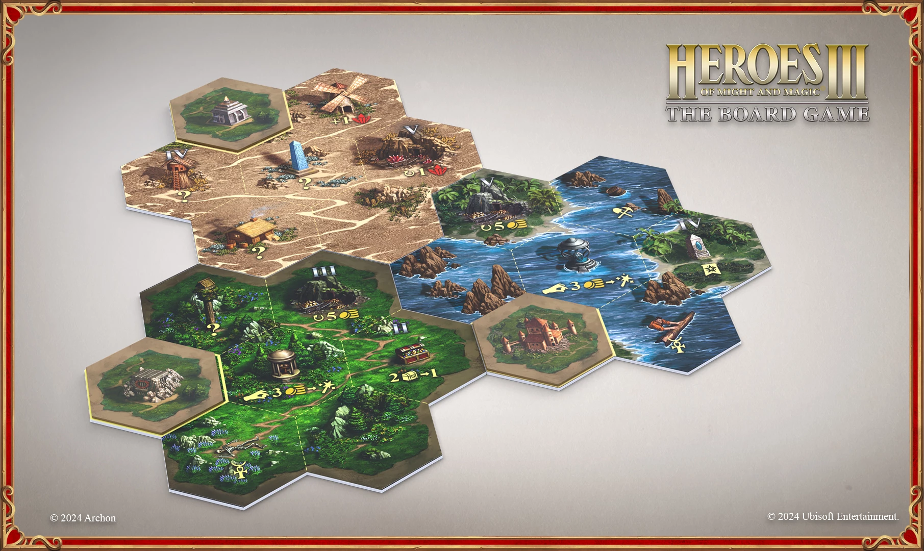 We’ll start with the new location tiles. These tiles feature locations familiar from the video game, where you could encounter varying quantities of specific units. We aim to bring this experience into the board game. These location tiles can replace blocked spaces on the board, and players can choose to swap a blocked space with a new location when revealing a tile.