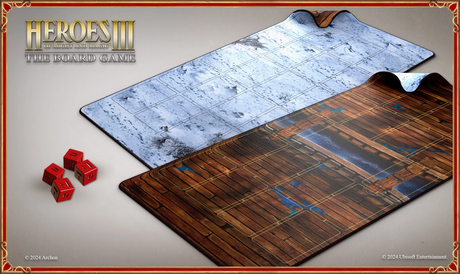 The last components in this expansion are two neoprene mats and additional attack dice. Their purpose is to provide extra comfort during gameplay. On one side, you’ll find the new naval combat board; on the reverse side, there’s the familiar combat board.