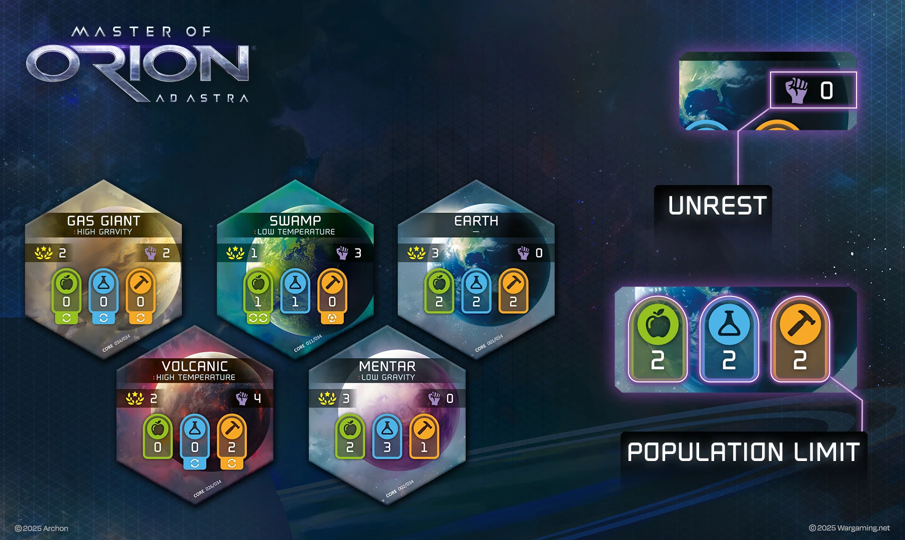Every planet has a limit on how many population units of each type it can support. Luckily, the galaxy is brimming with planets waiting to be colonized. As you expand your empire to new worlds, keep in mind that each newly colonized planet increases your empire’s unrest. Overextend too quickly, and unrest could become a significant problem.