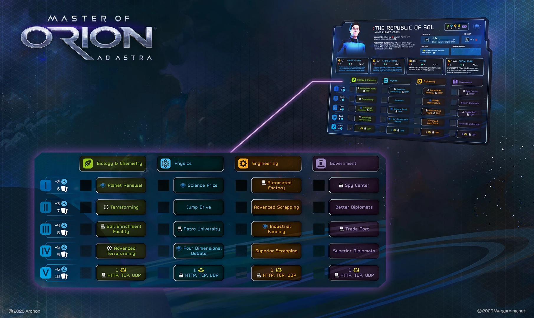 The final—and perhaps most critical—method of strengthening your empire is researching new technologies. To do this, you must perform a research action, which allows you to progress along the technology tree. This tree is divided into four branches: