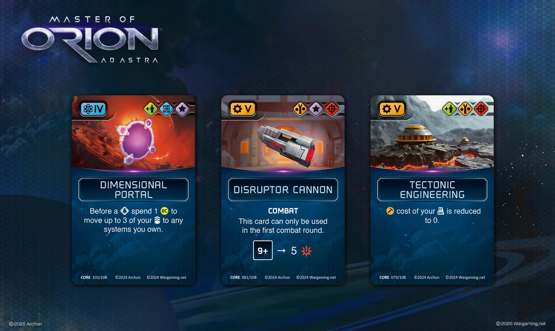 At the beginning of each round, players draft three technology cards. These cards serve a dual purpose: they can be used for immediate actions and, if the corresponding technology branch is upgraded to the required tier, retained as developed technologies. Developed technologies provide lasting benefits, from advanced ship weapons to enhancements for basic actions. With every new technology, your empire grows even stronger.