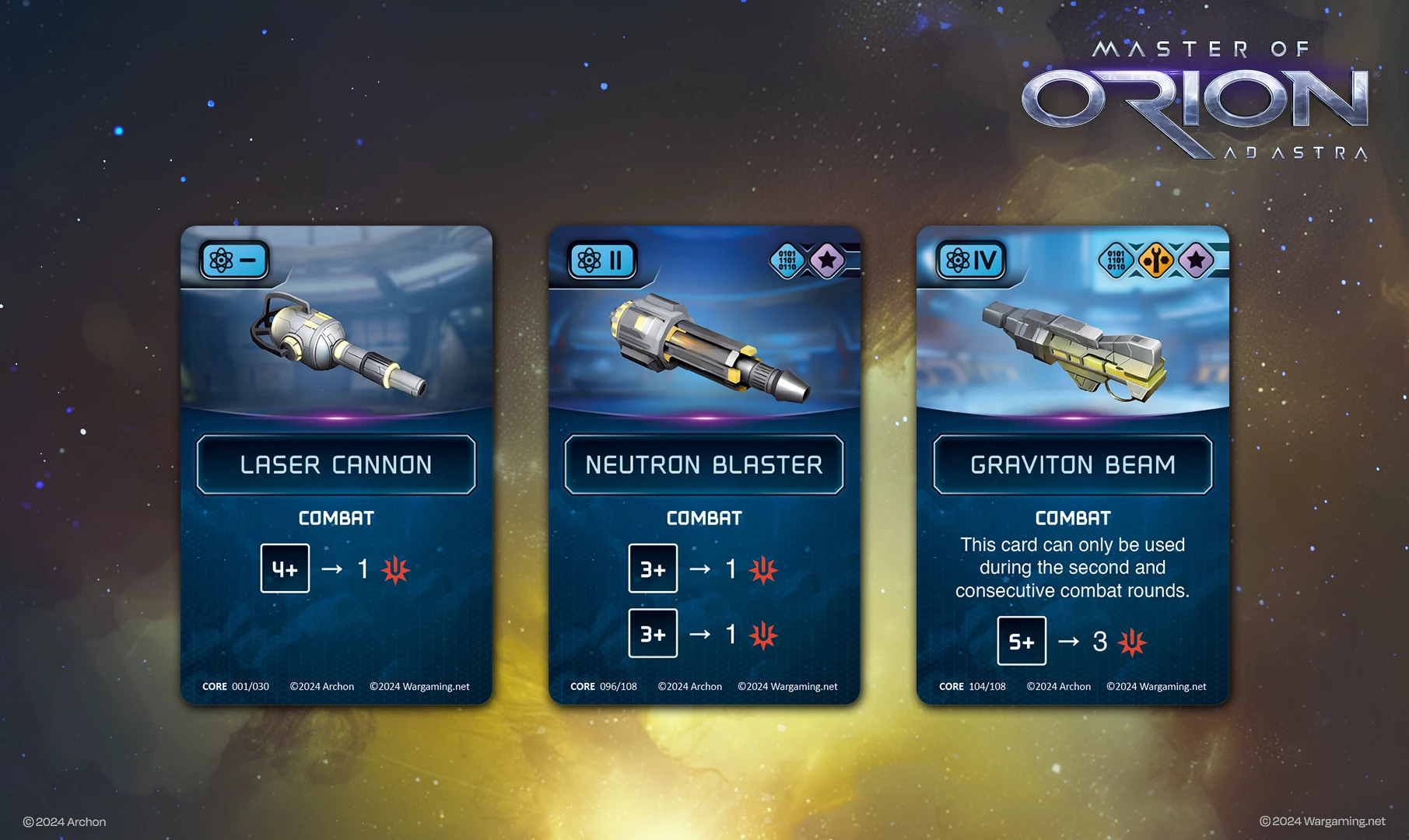 When combat begins, each player rolls a number of dice equal to the total firepower of ships that are participating on their side. They then use those dice results to activate combat effects, dealing damage and assigning it to opposing forces. These steps happen simultaneously, making combat quick and fluid. The process repeats until one side is either destroyed or retreats.