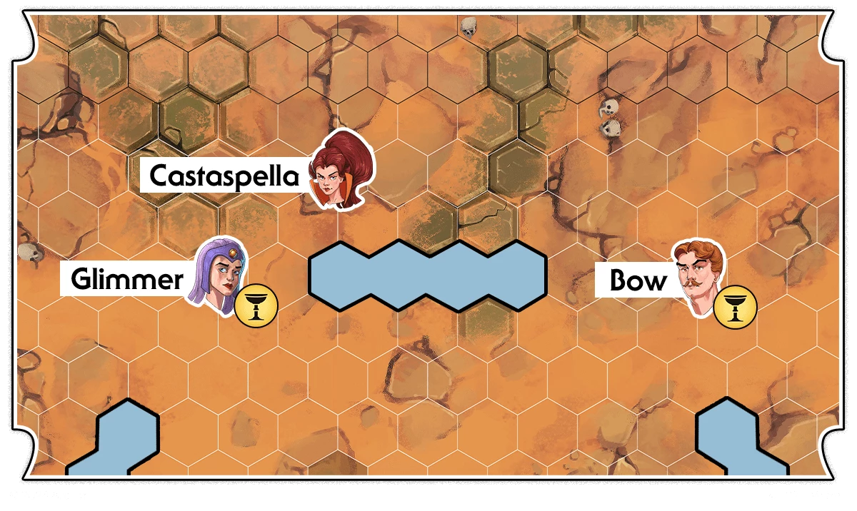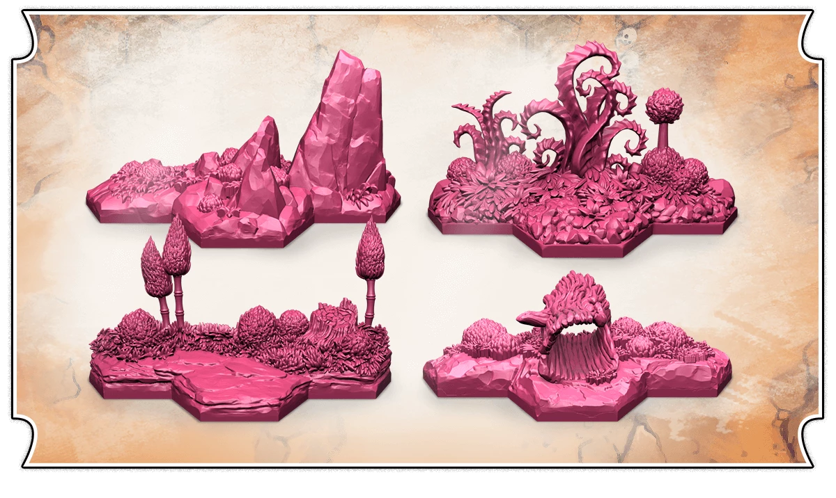 In this expansion, we unveil a new terrain type: magic forests. These low obstacles possess a unique quality, permitting the active character on the adjacent hex to expend mana to teleport to another hex adjacent to the magic forest. The addition of new battlegrounds within the expansion opens up countless opportunities to catch opponents off guard with unexpected movements.