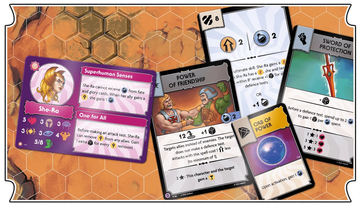 Armed with her iconic Sword of Protection, She-Ra is an unexpectedly resilient character. Like her brother, she doesn't acquire mana from fate and glory cards; instead, she gains it whenever her allies receive a buff. This unique ability enables her to accumulate mana outside her activation, providing a strategic advantage. She can utilize this mana to bolster her defenses with additional dice. However, She-Ra's prowess extends beyond mere defense. She has the ability to absorb buffs from her allies and unleash a devastating strike, capable of impressing He-Man himself.