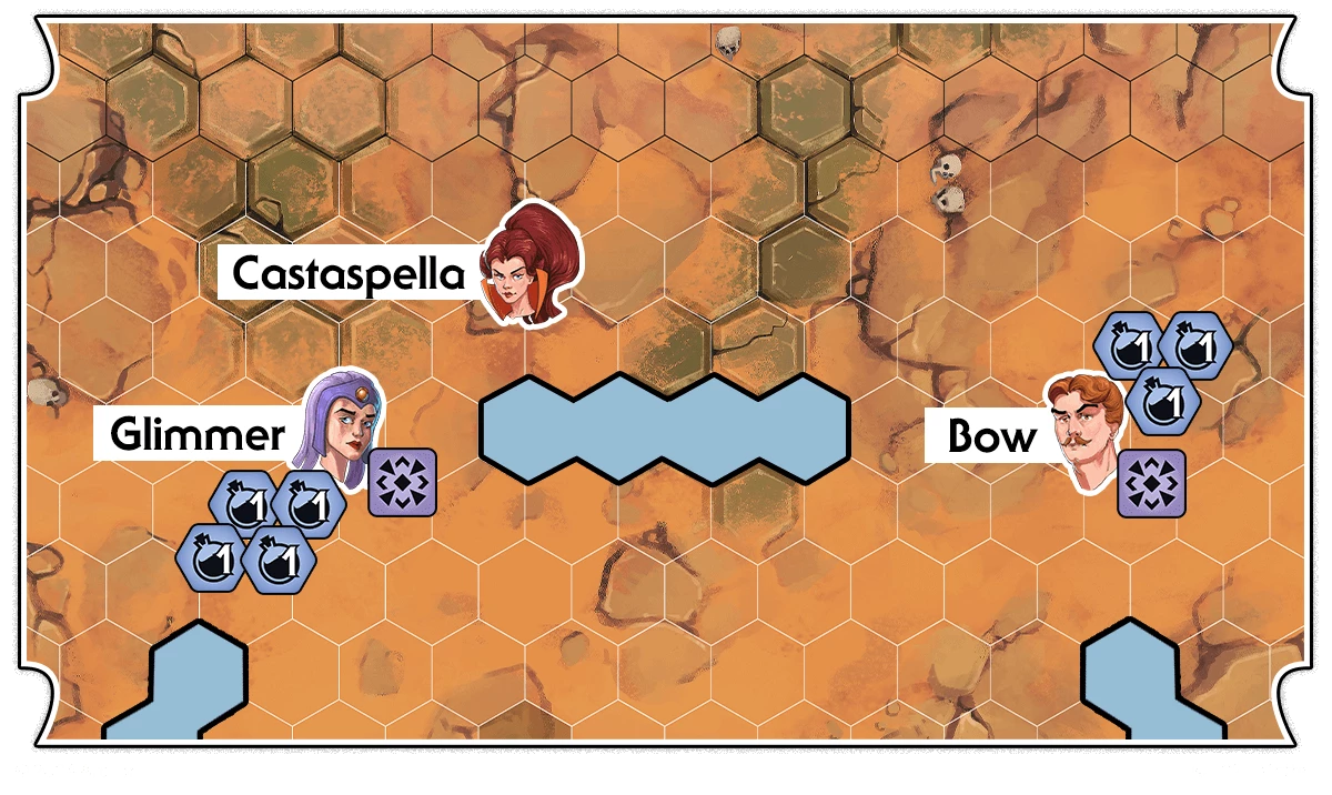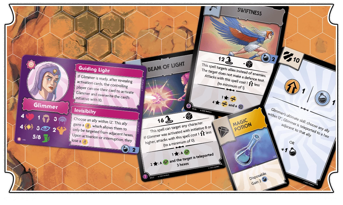 Glimmer takes on the crucial role of supporting her allies. Is her friend facing trouble? No problem; simply render them invisible and put their worries to rest. Is an enemy obstructing the objective? Swiftly teleport them away! And if an ally lacks the movement to reach the objective? Did I mention that Glimmer's teleportation abilities extend to her allies as well? While Glimmer may not excel in direct combat, her support abilities are a force to be reckoned with. Oh, and one more thing: regardless of the card played, she can always activate with an initiative of ten.