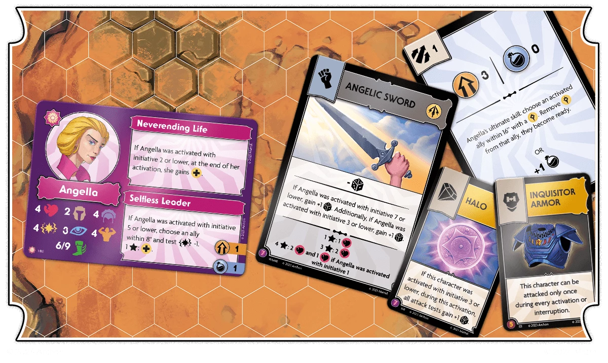Angella may seem an unlikely frontline fighter, especially with only four wounds to her name. However, a crucial detail sets her apart—Angella can heal herself and her allies. There's a catch, though: she can only do so when activated with a low enough initiative. Her iconic sword also becomes more powerful the lower her initiative, so choosing a proper activation card will be the key to victory!