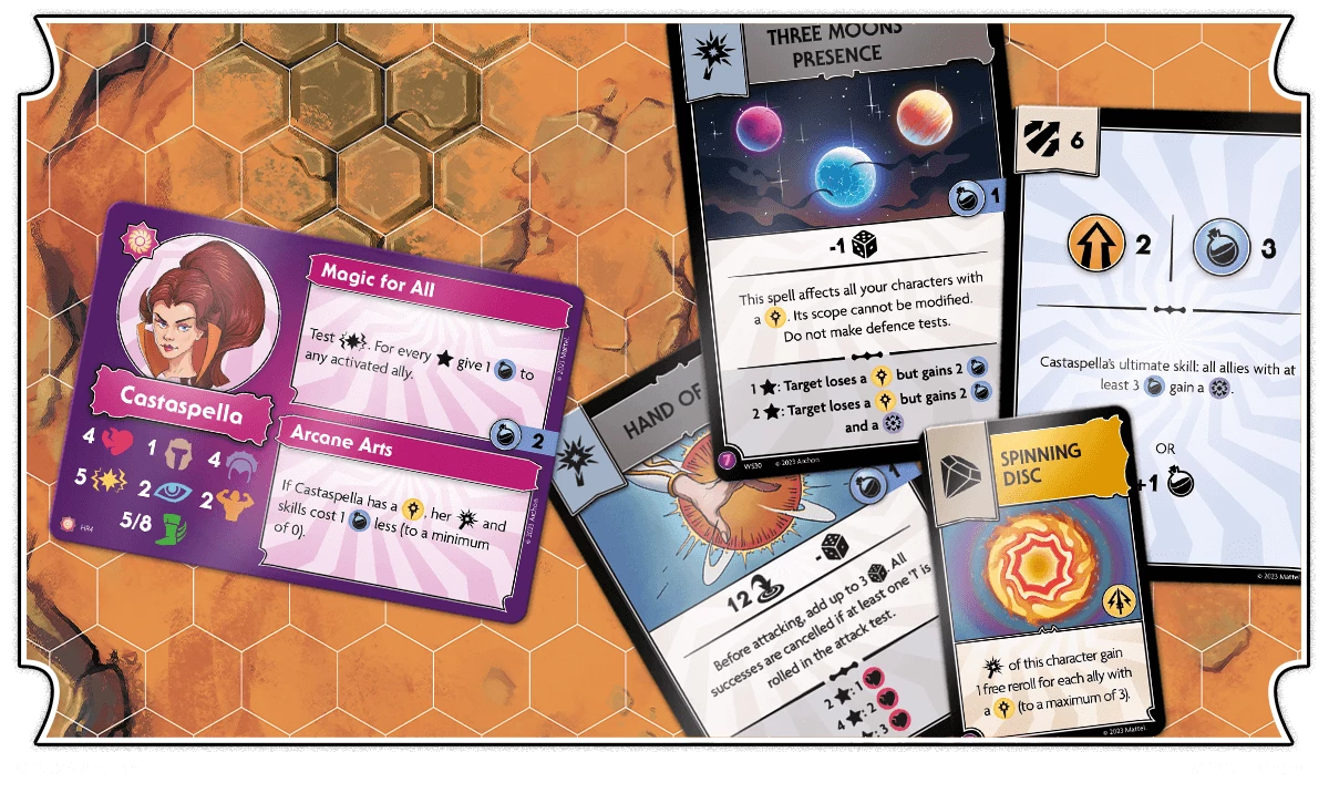 Castaspella is the primary mage within the ranks of the Great Rebellion. Ideally activated last in the round, she excels in providing her teammates with additional mana. Interestingly, she doesn't heavily rely on this resource herself, as when buffed, all her spells and active abilities cost one mana less. With her iconic disc enabling free re-rolls, she emerges as one of the game's most formidable spellcasters.