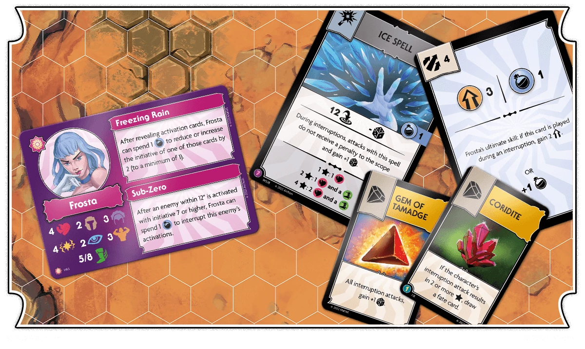 When it comes to halting enemy melee fighters, Frosta is your go-to character. She can interrupt any enemy within a twelve-inch range who activated with an initiative of seven or higher. Moreover, with her Ice Spell, she can effectively slow down the movement of interrupted characters. One might wonder if this ability could be easily circumvented by using cards with lower initiative. In theory, yes, but in practice, it isn’t easy, as Frosta can spend mana to alter the initiative on those cards.