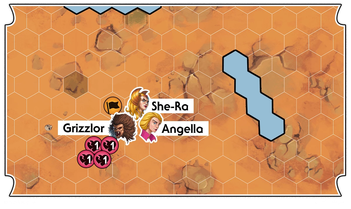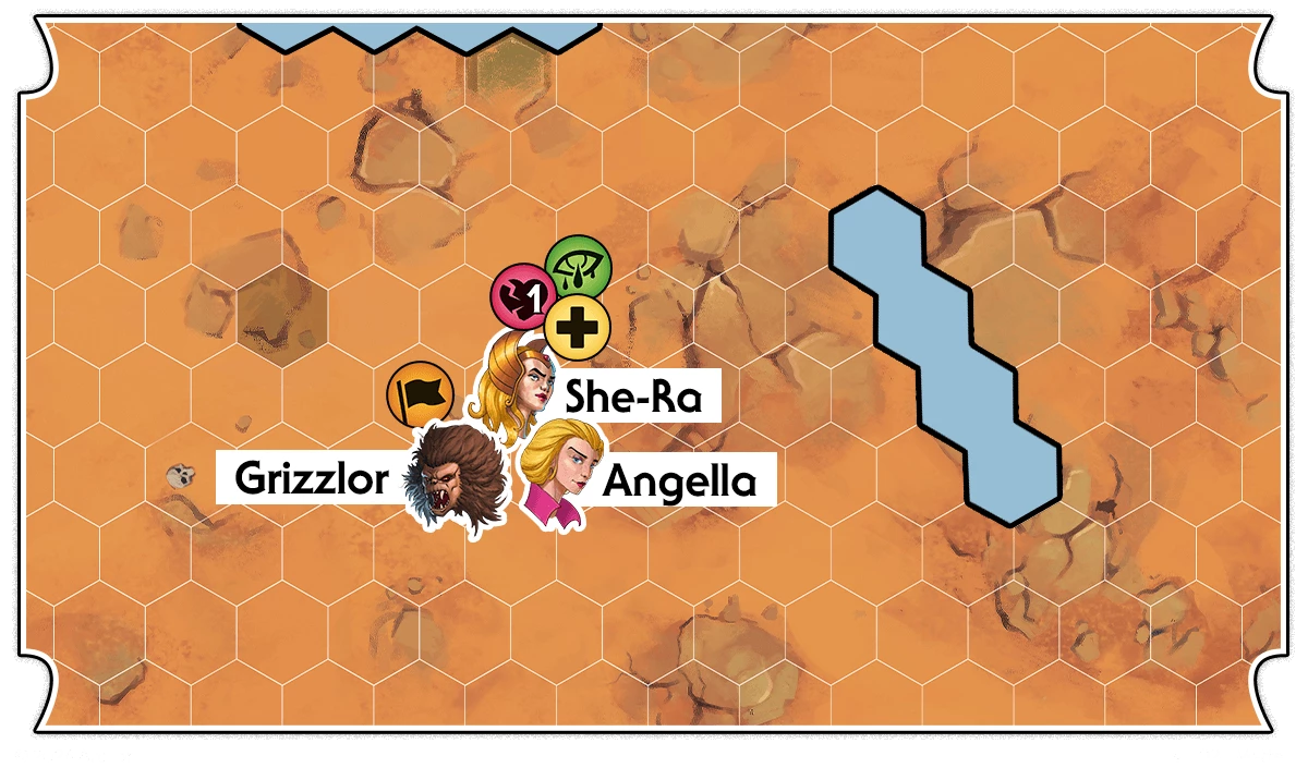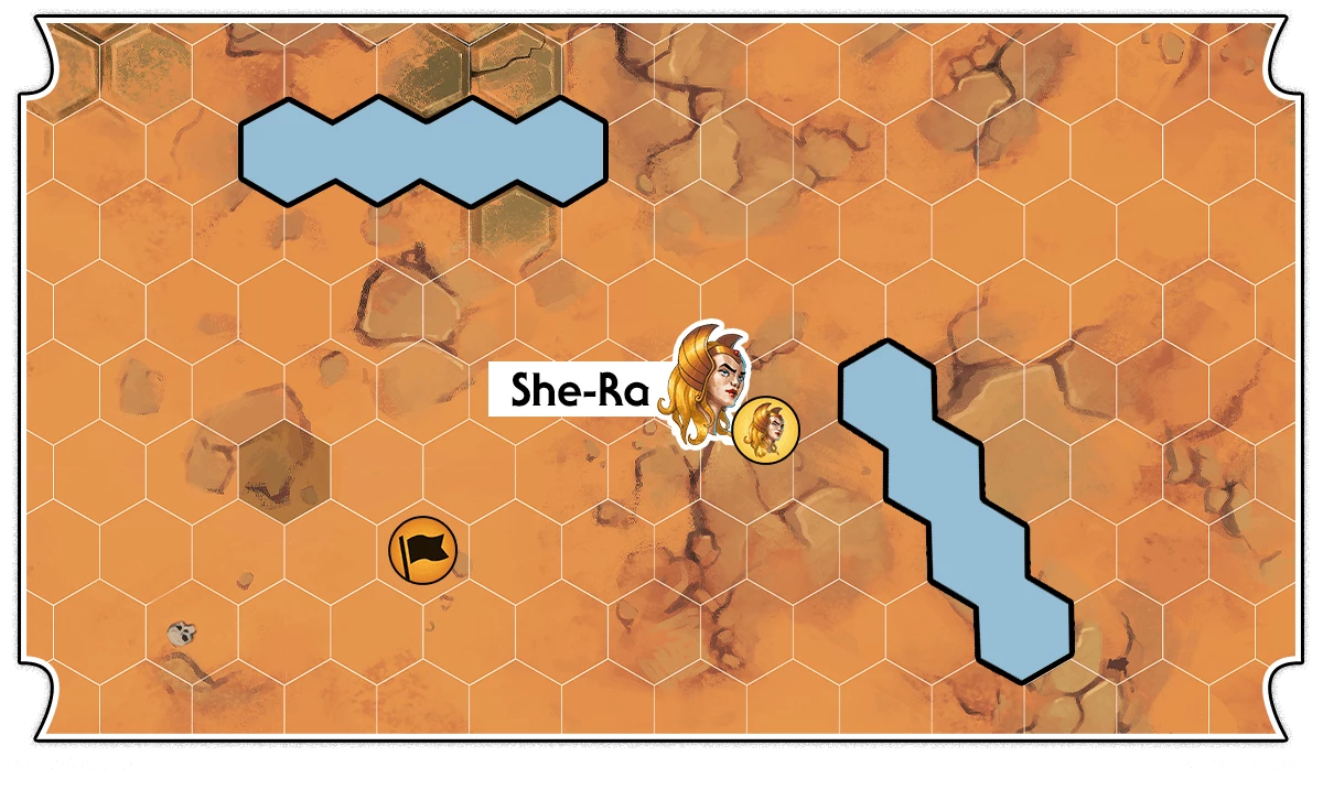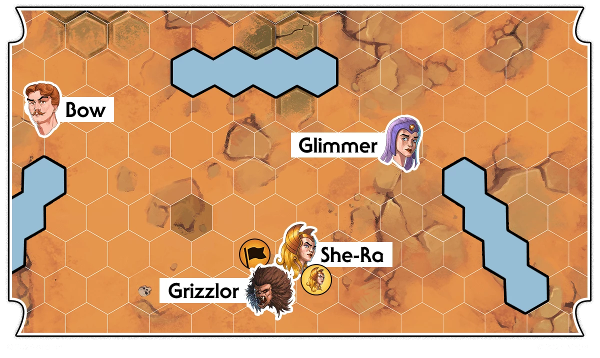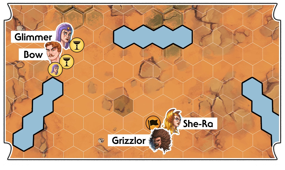 She-Ra takes the lead and acts as the first character in the round but cannot reach the objective. Is this the end of the line for She-Ra, who is left vulnerable to attacks and unable to make progress? Not quite. She still has a few tricks up her sleeve. First, she employs her ultimate skill to acquire a buff, granting her additional dice in defense tests. To accomplish the rest of her objectives, She-Ra will require a little help…