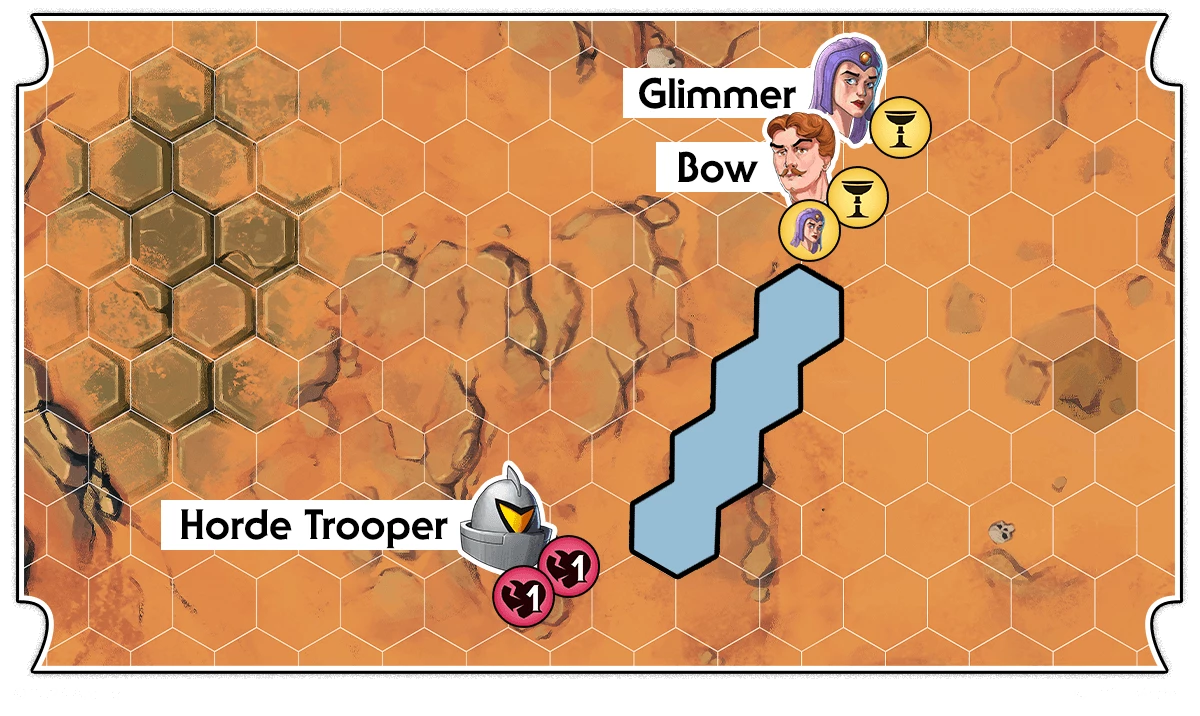 Bow starts his activation by utilizing the wrap item to preserve his invisibility buff. With two buffs in his possession, he can confidently confront the Horde Trooper. His initial attack inflicts two wounds.