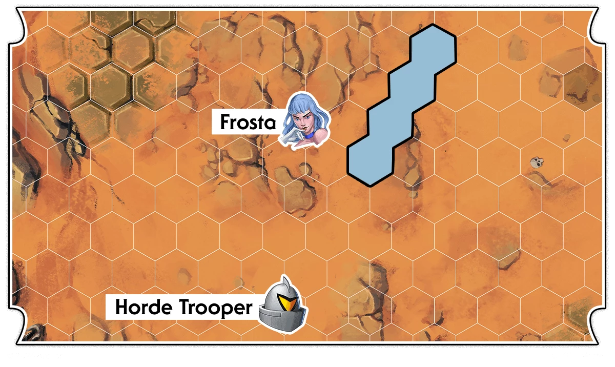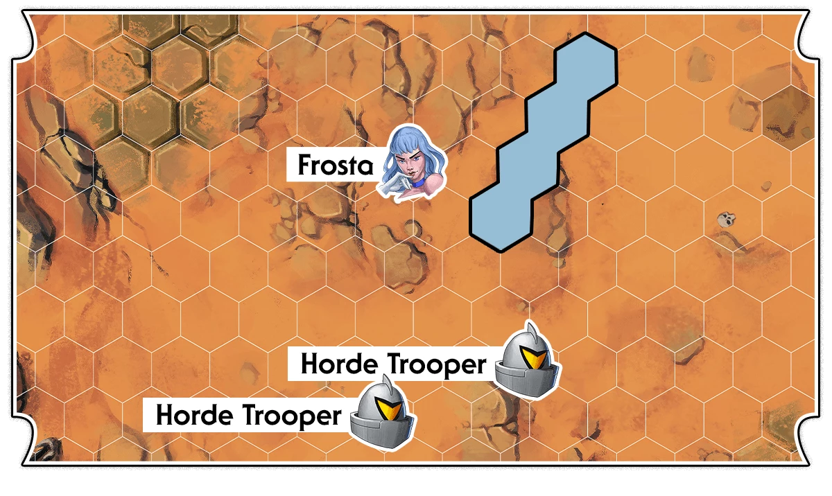 Frosta unleashes her spell, targeting a trooper. With the aid of two additional action points granted by her ultimate skill, she launches another attack. The first trooper is gone. Now, Frosta can commence her activation and confront the second adversary.